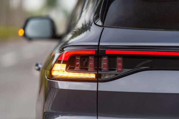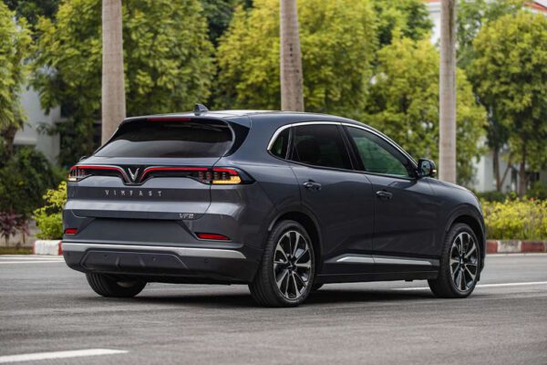 Khác với phần đầu với những đường cong mềm mại, đuôi xe VinFast VF8 cứng cáp hơn. Đèn hậu LED tương tự các dòng Lux A 2.0 và SA 2.0 khi dải LED định vị hình chữ V vắt ngang đuôi xe. Đây cũng là nhận diện đặc trưng của hãng và dễ nhận ra khi di chuyển trên đường.
