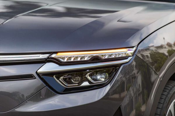 Chính giữa là là logo Vinfast cùng với dải đèn định vị ban ngày LED được làm theo hình cánh chim. So với Lux A và Lux SA, thì VF 8 đã thay đổi cách tạo hình đèn pha, không còn đơn thuần là một dải đèn mỏng mà sẽ là các bóng LED Projector và có tích hợp tính năng rửa đèn.