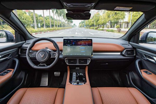 Khoang lái VF8 rộng và thoáng nhờ thiết kế tối giản với các chất liệu da cao cấp. Gần như các chức năng được gom vào màn hình cảm ứng cỡ lớn 15,6 inch đặt giữa bảng táp-lô. Điều này giúp giảm thiểu các nút bấm vật lý, giúp hành khách có thể dễ dàng điều hướng, trải nghiệm lái thú vị hơn trên những cung đường.