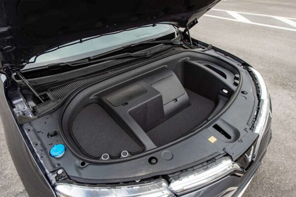Phần nắp capo cũng là một điểm nhấn khá ấn tượng, thay vì làm kiểu chúc xuống phía trước giống nhiều mẫu xe điện khác thì trên VF 8 đã làm dạng nắp capo nằm ngang tạo cảm giác dày dặn và rất thể thao. Với mô tơ điện gọn và ít các chi tiết kỹ thuật hơn xe máy xăng, dầu, phần đầu xe VF8 có nhiều không gian trống tạo thành một cốp phụ, bên cạnh cốp chính ở đuôi xe.