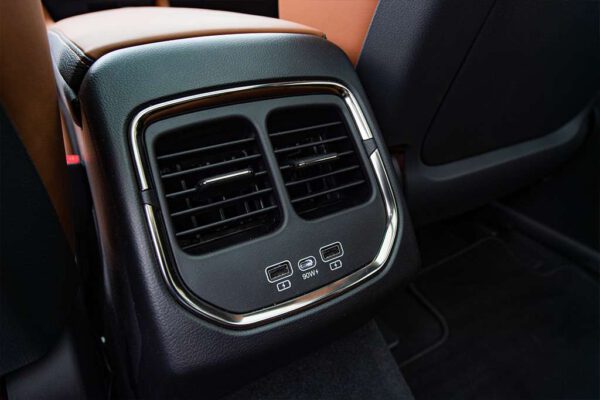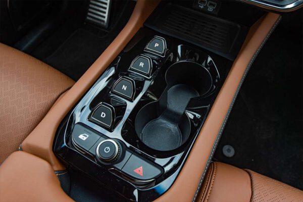 “Cần số” trên VF 8 được làm theo dạng nút bấm điện tử thay vì cần số điện tử như trên các dòng Lux hay núm xoay như trên VF e34. Phanh tay điện tử không được trên “Yên ngựa” mà lại được bố trí ở vị trí khá khuất, bên cạnh cửa gió điều hòa.